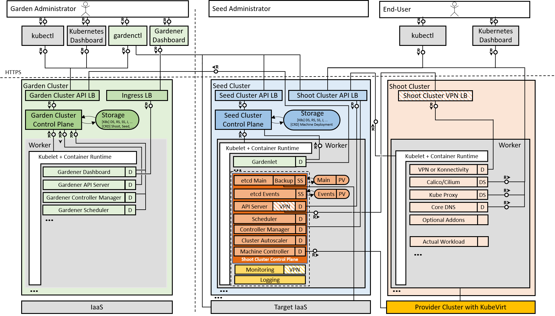 Gardener is based on the idea of three types of clusters – Garden cluster, Seed cluster and Shoot cluster (see Figure 1). The Garden cluster is used to control the entire Kubernetes environment centrally in a highly scalable design. The highly available seed clusters are used to host the end users (shoot) clusters’ control planes. Finally, the shoot clusters consist only of worker nodes to host the cloud native applications.